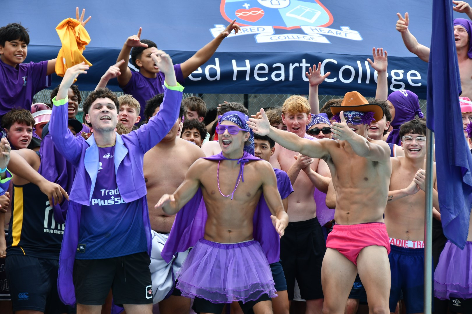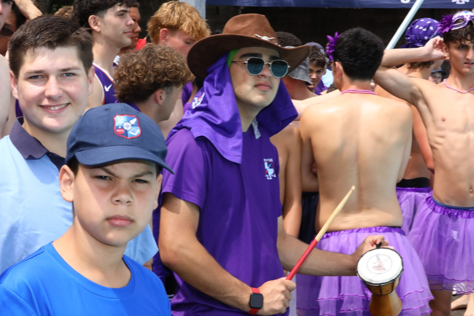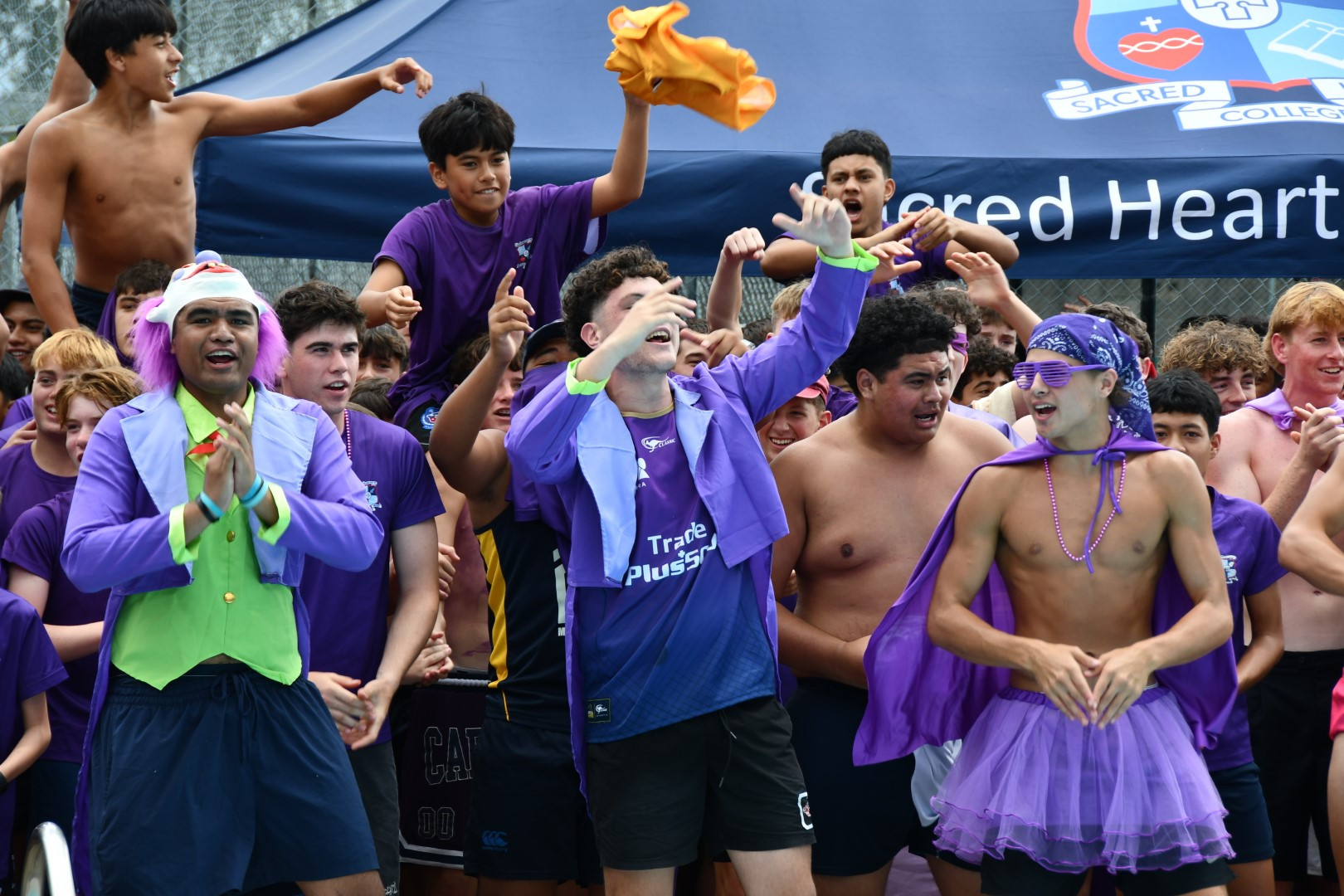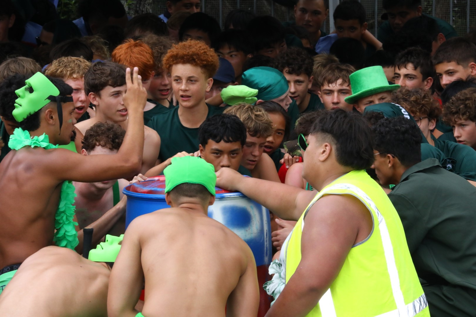 Drums, tambourines, barrels, and even a saxophone featured, accompanied by the boys’ thunderous voices, choreographed by our house leaders into outstanding routines. Of particular note this year was Stephen House getting their separated Year 7 students to join in from the above bank, and Pompallier ending the competition off with a whole-school chant.
